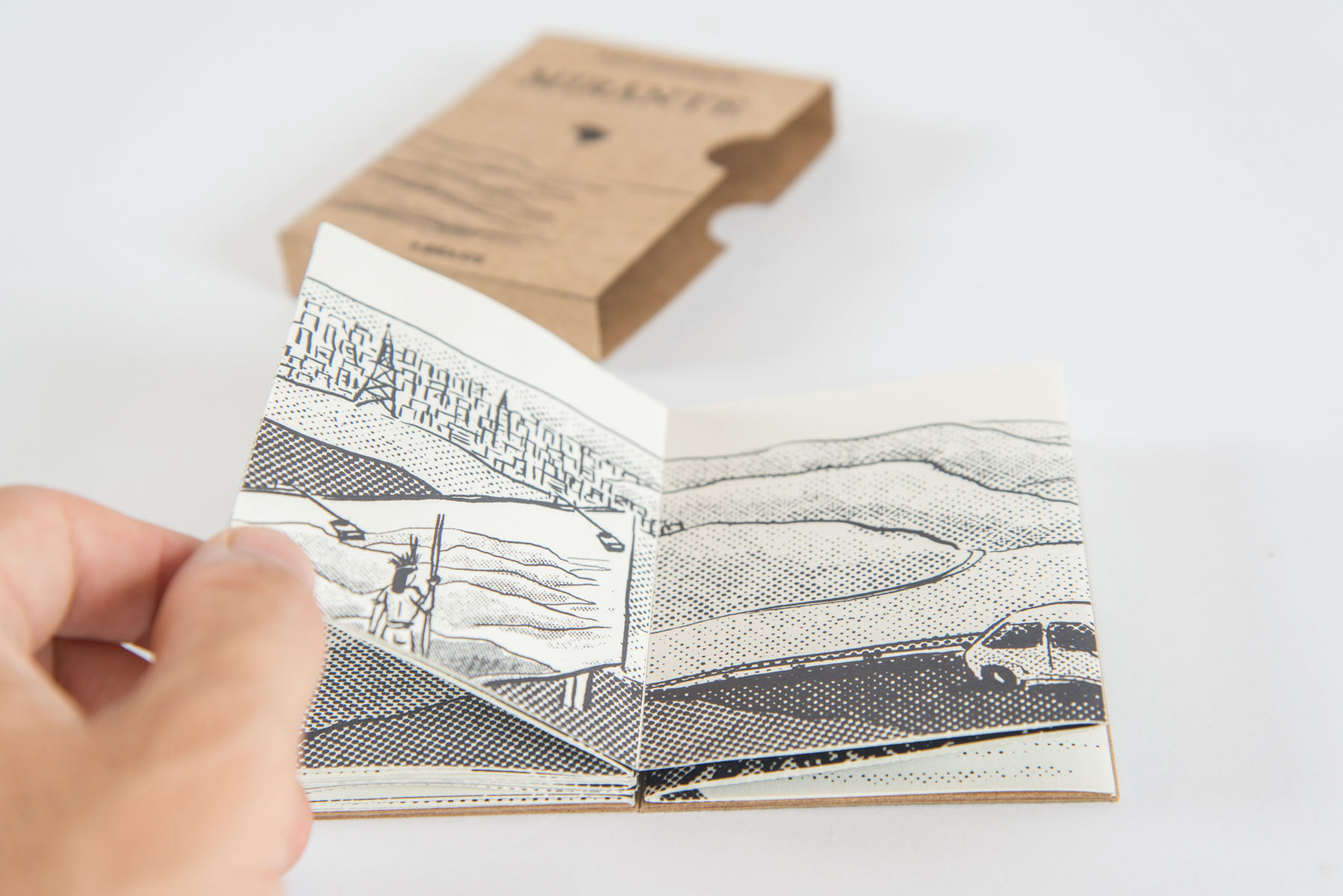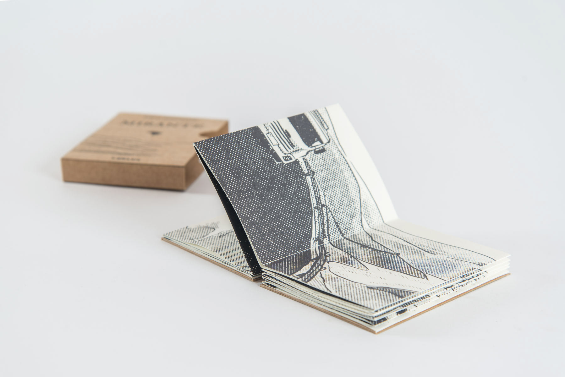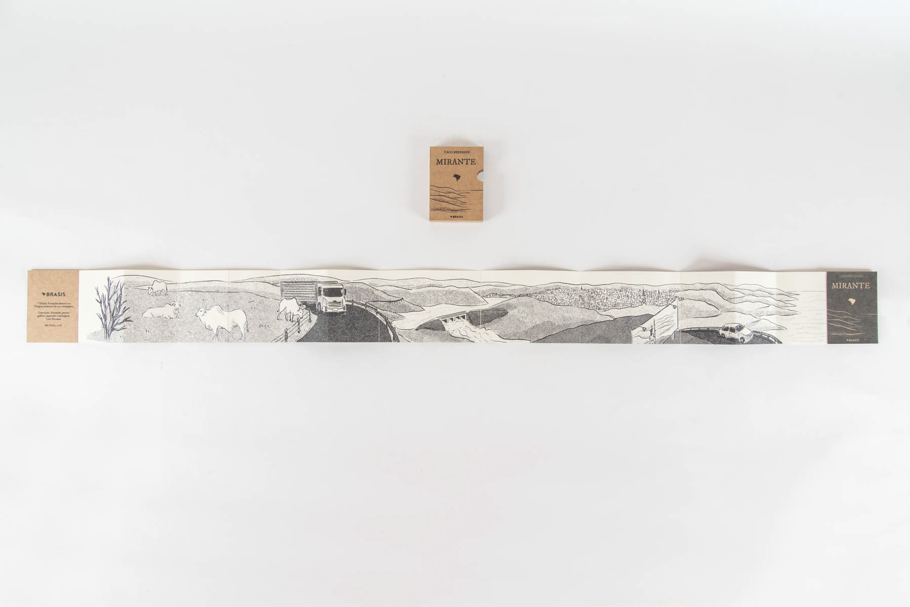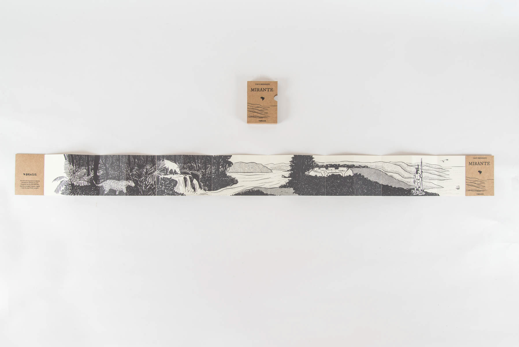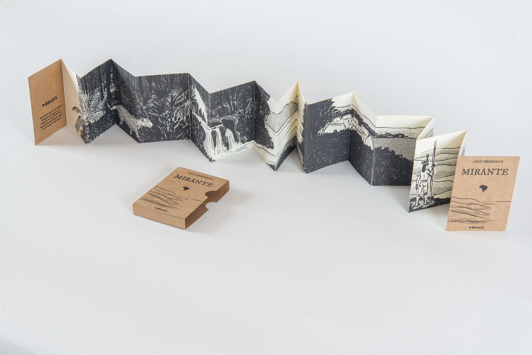 Livro autoral em formato sanfona, todo montado de modo artesanal e manufaturado, apresenta dois momentos de uma mesma paisagem.